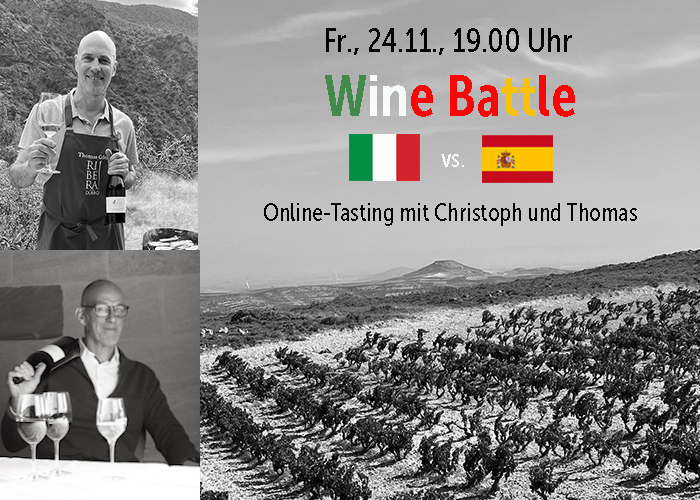 Mit Christoph Schönegge, meinem Kollegen am International Wine Institute, treffe ich mich am Freitag, den 24. November, um 19.00 Uhr bei Zoom zu einem italienisch-spanischen "Wine Battle".